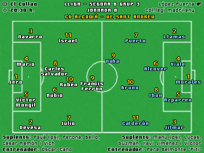 A favor del quadribarrats, cal dir que els homes d’Óscar Cano no arriben en el seu millor moment possible. Dos punts per sota del Sant Andreu, l’equip es troba incòmode en posicions tan enrederides en la classificació. Com és costum les últimes temporades, l’Alcoià té l’objectiu de classificar-se per la promoció d’ascens però, fins ara, ha aconseguit només dues victòries (totes dues per la mínima a El Collao) i dos empats, un dels quals a domicili. Un pobre bagatge si es vol estar a la part alta de la taula. Això sí, cla tenir en compte que davant la seva afició només ha encaixat un gol. A les seves files, hi destaca un vell conegut de l’afició andreuenca: Francis Ferrón. El davanter va jugar al Sant Andreu la primera volta de la passada temporada. Al mercat d’hivern, però, va al·legar motius personals per deixar l’equip, del qual era el màxim golejador, i fitxar per La Hoya Lorca. Aquesta temporada ja acumula tres gols.