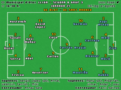 Per aconseguir el triomf, els jugadors del Sant Andreu hauran d’estar molt alerta de dos jugadors de referència ofensiva del conjunt olotí. Corominas i Carlitos, amb set i vuit gols respectivament són els màxims golejadors de l’equip i entre tots dos sumen més de la meitat de les dianes de l’Olot.